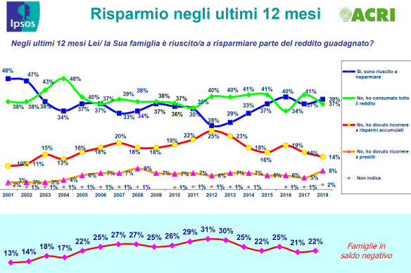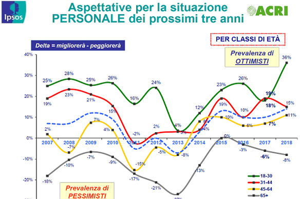 Come ogni anno, alla vigilia della Giornata Mondiale del Risparmio, Acri ha presentato i risultati dell’indagine sugli Italiani e il Risparmio, che da diciotto anni realizza insieme a Ipsos per questa occasione. Quest’anno, la parola chiave per leggerli è incertezza. Il 2018 sembra, infatti, essere un anno di attesa per molti italiani, che stanno vivendo una situazione non definita, un equilibrio precario, sospesi tra un passato recente, rispetto al quale si rendono conto dei miglioramenti, e grandi aspettative per il futuro. Peraltro la crisi non sembra definitivamente superata (gli italiani si attendono in media ancora 4 anni di crisi); il presente appare complesso e contraddittorio. L’ottimismo circa il futuro sembra essere molto diffuso nel Centro-Sud, soprattutto tra coloro che hanno meno di 30 anni (gli ottimisti riguardo la situazione personale sopravanzano i pessimisti di 36 punti percentuali), che negli anni passati si erano mostrati più negativi. Appare, invece, più in difficoltà il Nord Est; fra coloro che si trovano nella fascia d’età tra i 31 e i 44 anni cresce il numero di quelli che temono un peggioramento delle prospettive, sicché il differenziale tra ottimisti e pessimisti, pur sempre a favore dei primi, passa da +18 a +15. Probabilmente perché sono soprattutto gli adulti in questa fascia d’età, nella quale si consolidano le basi strutturali della propria vita, quelli che dichiarano un peggioramento delle condizioni di lavoro (contratto, guadagno, orario). Complessivamente hanno dichiarato un peggioramento delle condizioni di lavoro l’11% degli italiani contro il 5% del 2017. Nel 2018 quelli che dichiarano di essere stati colpiti direttamente dalla crisi riguardo al lavoro sono il 24%, in crescita rispetto al 19% del 2017; un dato questo in contrasto con il fatto che è parimenti in aumento il numero delle famiglie che non hanno avuto nessuna difficoltà a mantenere il proprio tenore di vita (sono il 37%, erano il 35% nel 2017, il 32% nel 2016).