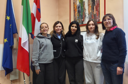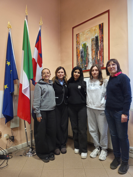 da sx Inas Tazouda, Sandra Bosco, Dirigente Scolastico dell’I.T.C. Bonelli di Cuneo, Aya Taoussi, Karola Hoxhaj, Licia Vico, Professoressa di Economia Aziendale della classe 5^ b Amministrazione, Finanza e Marketing