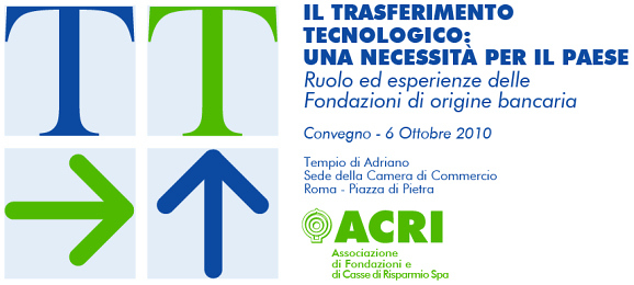 Il 6 ottobre 2010 si è tenuto a Roma il convegno “Il trasferimento tecnologico: una necessità per il Paese. Ruolo ed esperienze delle Fondazioni di origine bancaria”, promosso dalla Commissione Ricerca dell’Acri. I lavori della giornata si sono articolati in tre fasi. Nella prima, aperta da Andrea Landi, presidente della Commissione Ricerca Scientifica dell’Acri, è stato presentato un approfondimento strutturato sui numerosi interventi realizzati dalle Fondazioni in questo campo, curato dal prof. Maurizio Sobrero dell’Università di Bologna. La seconda parte, introdotta dal presidente dell’Acri, Giuseppe Guzzetti, ha visto gli interventi di: Enrico Decleva, presidente della Crui – Conferenza dei Rettori delle Università Italiane; Daniel Kraus, vicedirettore generale di Confindustria; Mariastella Gelmini, ministro dell’Istruzione, dell’Università e della Ricerca. Nella terza parte si sono succedute le testimonianze di esperienze delle Associate: sulle società strumentali e le forme di collaborazione tra Fondazioni, enti di ricerca e imprese; nonché sul ruolo delle Fondazioni nel venture capital.