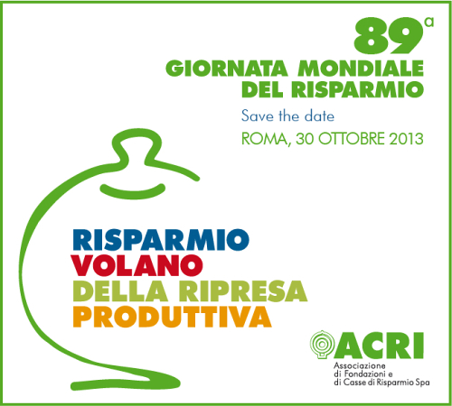Mercoledì 30 ottobre 2013 a Roma, presso il Palazzo della Cancelleria in Piazza della Cancelleria 1, si è celebrata l’89ª Giornata Mondiale del Risparmio, organizzata dall’Acri, sotto l’Alto Patronato del Presidente della Repubblica. Titolo dell’edizione di quest’anno è “Risparmio volano della ripresa produttiva”. Sono intervenuti: Fabrizio Saccomanni, ministro dell’Economia e delle Finanze; Ignazio Visco, governatore della Banca d’Italia; Giuseppe Guzzetti, presidente dell’Acri; Antonio Patuelli, presidente dell’Abi.