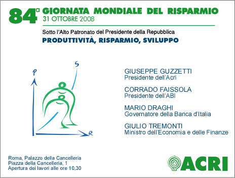 Venerdì 31 ottobre 2008, presso il Palazzo della Cancelleria, in Piazza della Cancelleria 1, si celebrerà l’84ª Giornata Mondiale del Risparmio, organizzata dall’Acri – Associazione di Fondazioni e di Casse di Risparmio Spa. Titolo dell’edizione di quest’anno è “Produttività, Risparmio, Sviluppo”. Interverranno: Giulio Tremonti, ministro dell’Economia e delle Finanze; Mario Draghi, governatore della Banca d’Italia; Giuseppe Guzzetti, presidente dell’Acri; Corrado Faissola, presidente dell’Abi.